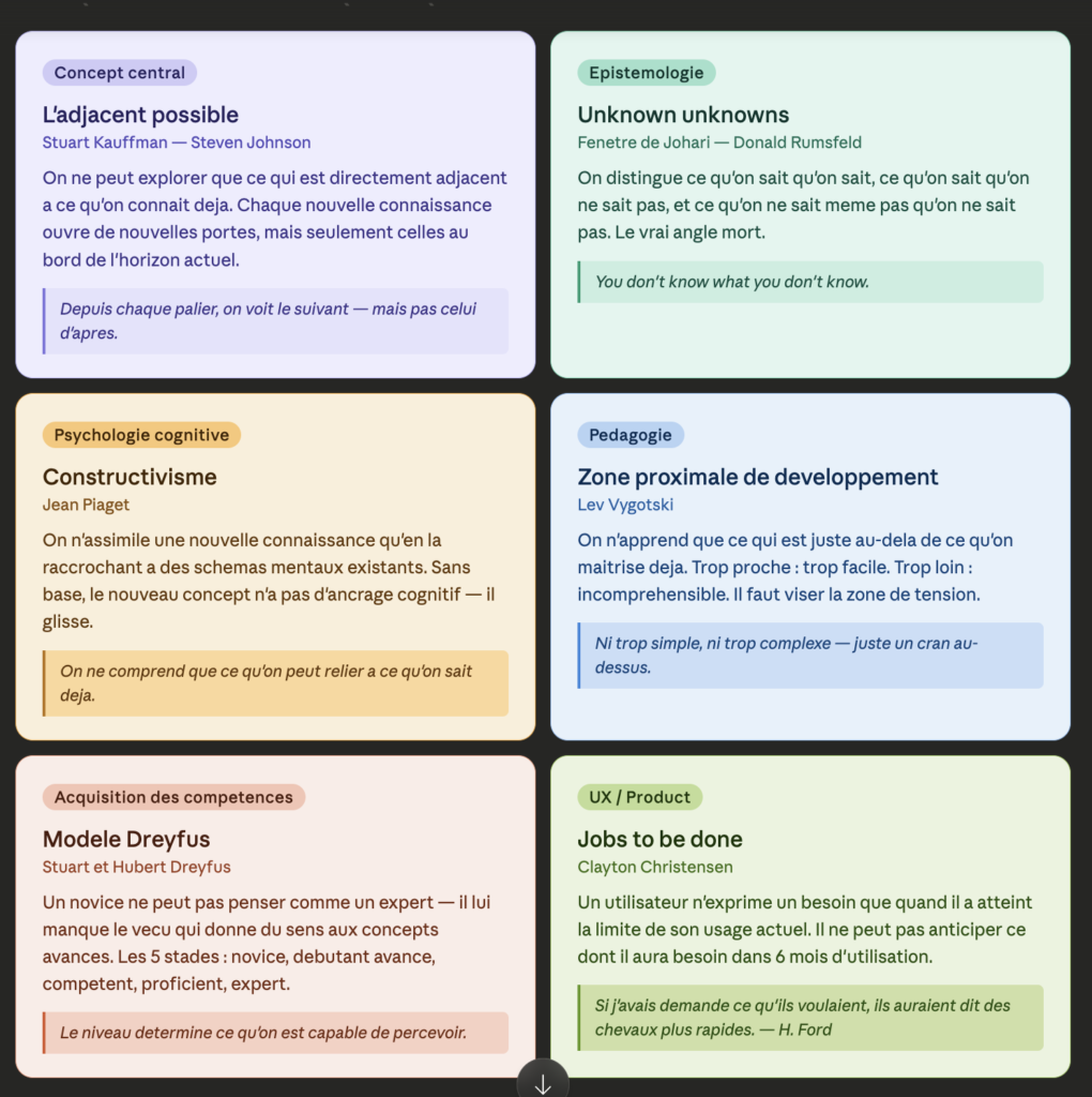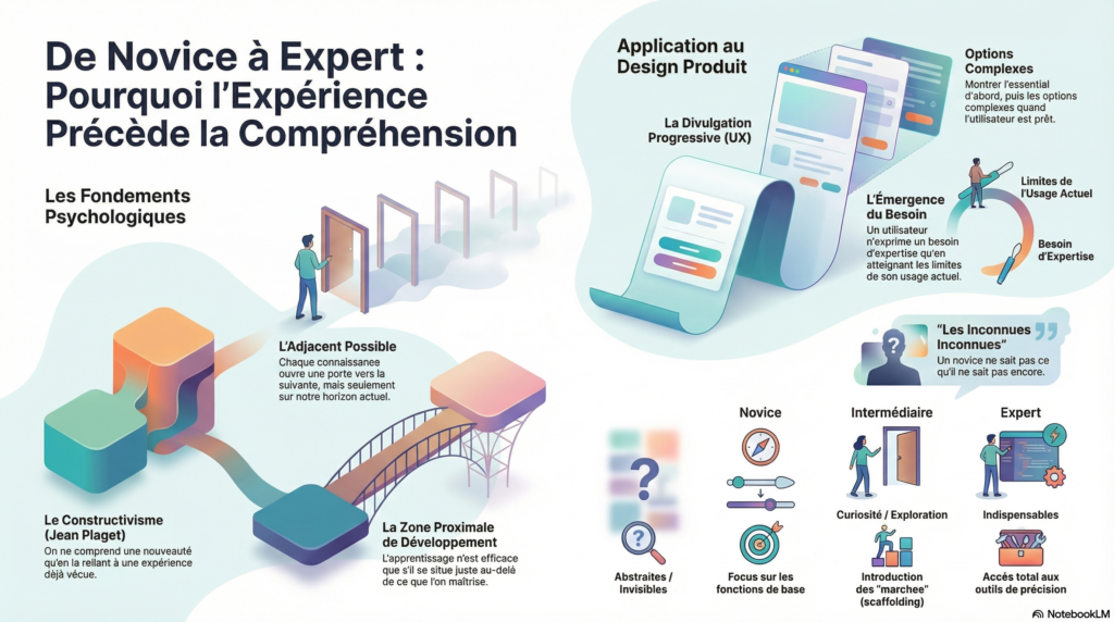 Théories mobilisées : L’adjacent possible (Kauffman / Johnson) · Constructivisme (Piaget) · Zone proximale de développement (Vygotski) · Modèle Dreyfus · Unknown unknowns (Johari / Rumsfeld) · Jobs to be done (Christensen) · Progressive disclosure (UX design)